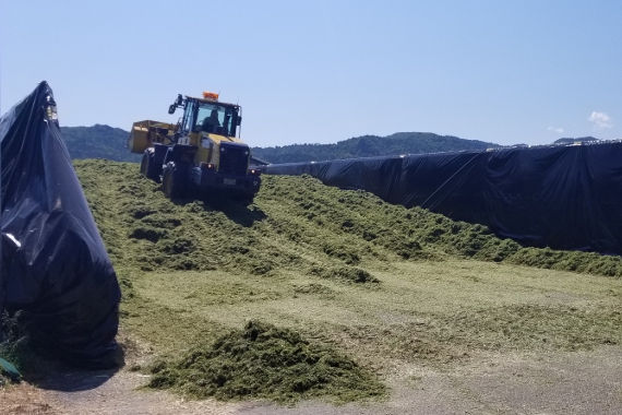 バンカーサイロは、トウモロコシなどの飼料を粉砕し、壁に囲まれたスペースへ積み上げて発酵させる貯蔵方法です。重機でしっかり踏み固め、シートと重しで密閉することで乳酸発酵が進み、雑菌の繁殖を防ぎながら長期保存に適した良質な飼料が仕上がります。